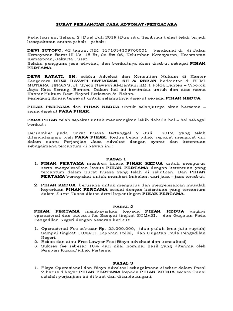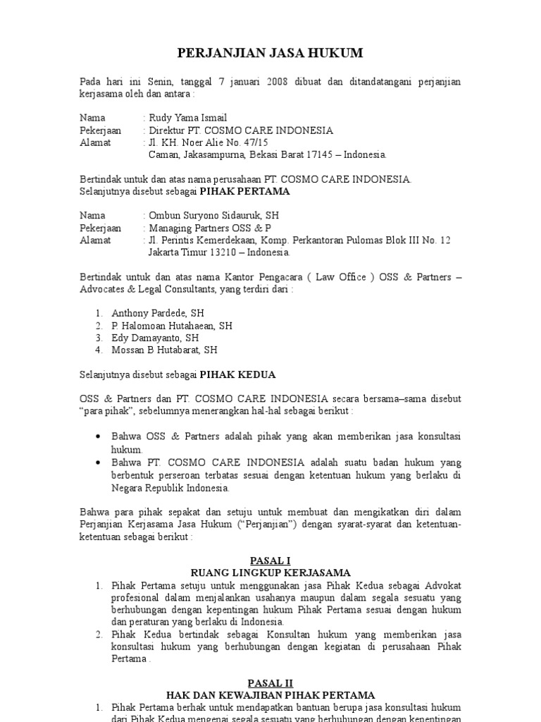 Contoh surat perjanjian kerjasama jasa. Penyerahan kasus baik hukum perdata / hukum pidana dari pihak pertama kepada pihak kedua tersebut pada pasal 1 ayat (1) diatas, dimaksudkan untuk memperoleh penyelesaian yang tuntas dan atau memperoleh keputusan hukum yang berkedudukan tetap / pasti, dimana untuk keperluan itu pihak pertama menyerahkan kepada pihak kedua dan pihak kedua menerima dari pihak pertama, berupa: Demikian perjanjian kerja dibidang jasa konsultan dan bantuan hukum ini dibuat dan mulai mengikat sejak ditanda tanganinya surat perjanjian ini. Ini dilakukan untuk menghindari suatu hal yang tidak diinginkan. Pihak p ertama berkewajiban memberikan honor/imbalan jasa konsultasi /bantuan h ukum kepada pihak kedua sebesar.(nominal perjanjian jasa hukum).