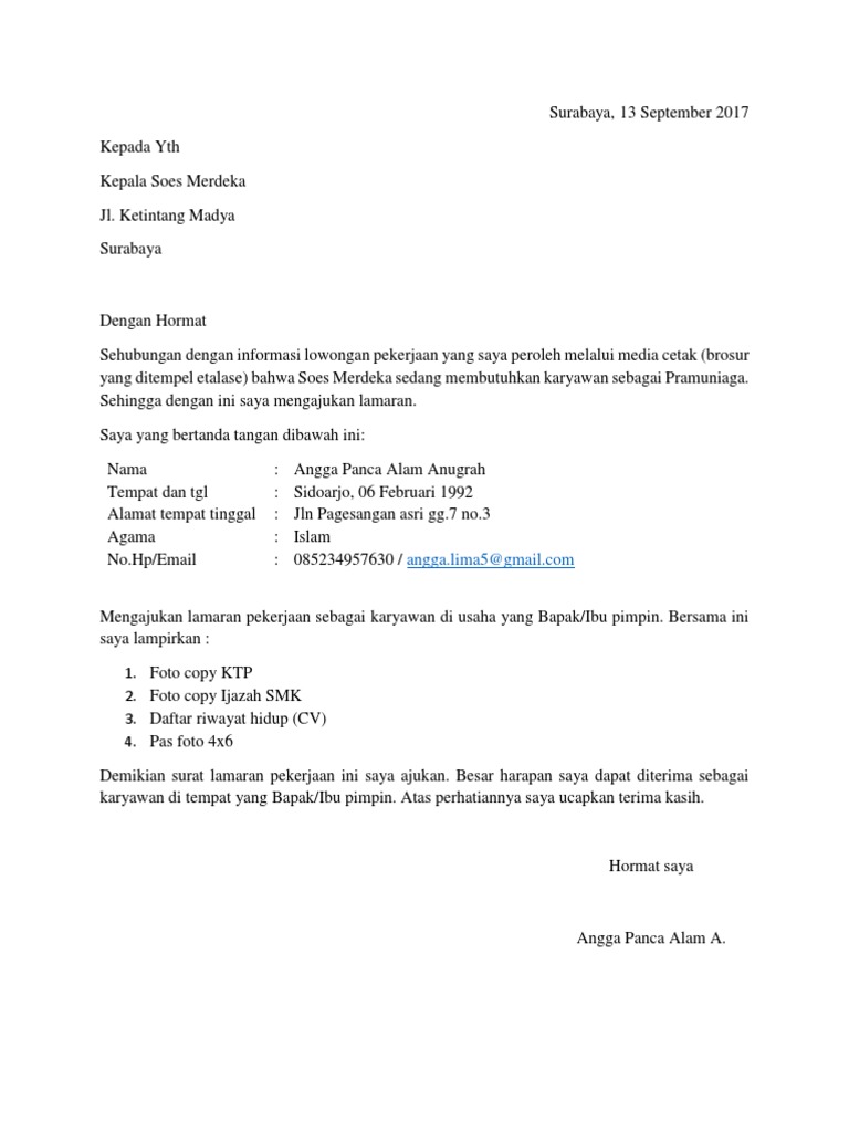 Contoh surat lamaran kerja di toko untuk berbagai posisi sebuah usaha yang bergerak di bidang penjualan, tentunya akan membutuhkan tenaga kerja yang mumpuni dalam pemasaran. Namun, kamu juga bisa, kok, membuat surat lamaran kerja dengan tulis tangan. Contoh surat lamaran kerja tulis tangan yang baik dan benar bisa menjadi referensi yang tepat buat kamu. Surat lamaran adalah gambaran diri anda di hadapan perusahaan. Dengan hormat, berdasarkan informasi yang saya peroleh melalui media sosial facebook, saya mengetahui toko aneka jaya membutuhkan posisi sebagai kasir. Contoh surat lamaran kerja tulis tangan. Di antara sarana komunikasi yang disebut di atas, surat mempunyai beberapa kelebihan dibandingkan dengan yang lainnya, yaitu bisa menyampaikan pikiran sesuai dengan kehendak secara lengkap, tanpa dibatasi oleh ruang dan waktu, pembaca bisa membacanya. Selain itu, surat lamaran kerja tulis tangan juga dapat dijadikan pertimbangan oleh pihak perusahaan maupun lembaga. Saya bermaksud mengajukan lamaran kerja di toko maju makmur mak mayong yang bapak/ibu pimpin untuk menempati posisi sebagai karyawan penjaga toko. The collection that comprising chosen picture and the best amongst others. Dengan hormat, berdasarkan informasi yang saya peroleh melalui media sosial facebook, saya mengetahui toko murah jaya membutuhkan karyawan toko baru. Apakah anda sedang mencari informasi contoh surat lamaran kerja di toko baju tulis tangan. Surat lamaran kerja biasa diketik di microsoft word untuk hasil yang lebih rapi.